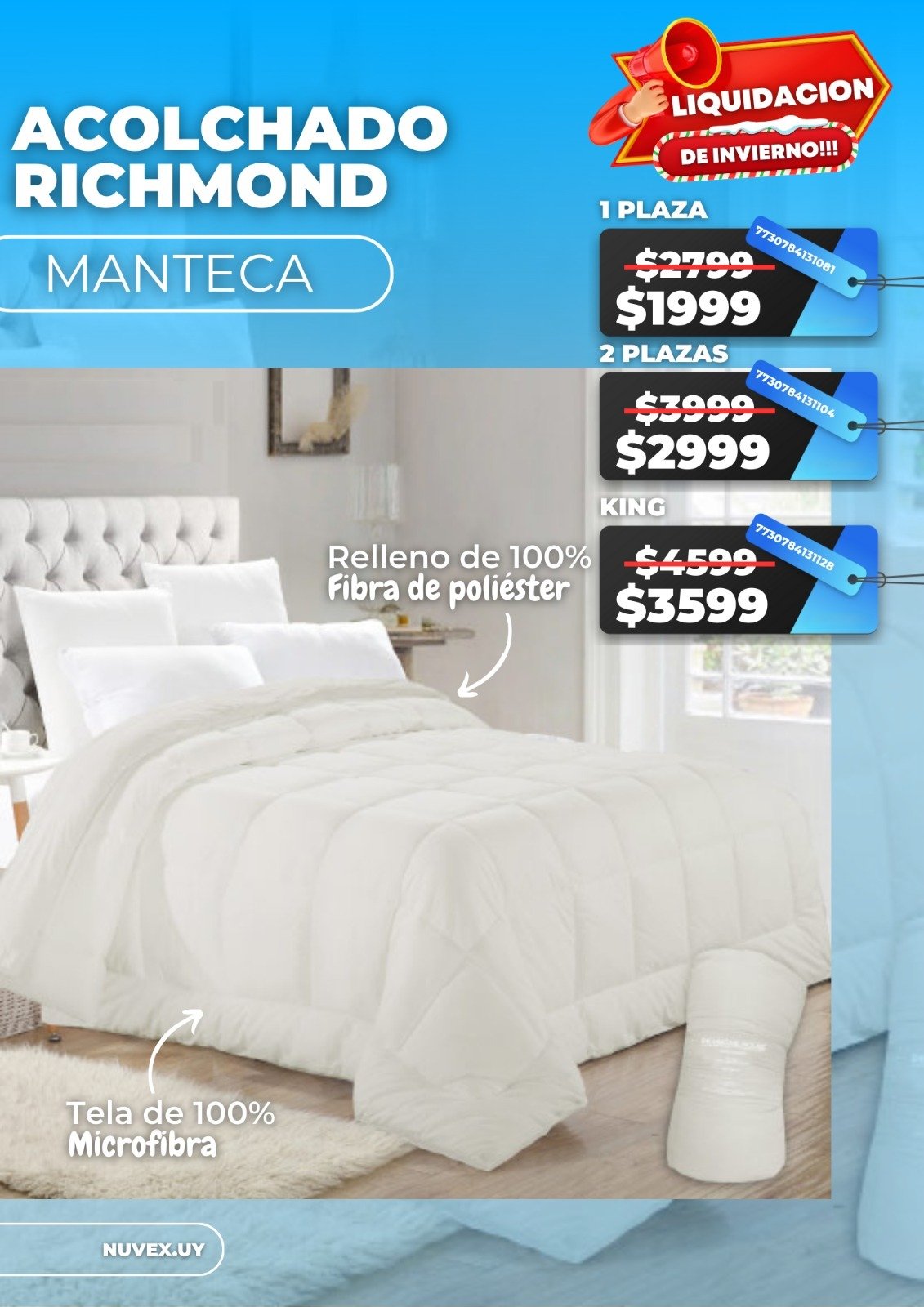 Acolchados Richmond color manteca (3 tamaños) CategoríasProductos físicos Infantil Hogar Campañas publicitarias Quienes somos Acolchados Richmond color manteca (3 tamaños) Acolchados Richmond Tela 100% Microfibra Relleno 100% Fibra de poliéster 1 Plaza >> $1999 (antes $2799) 2 Plazas >> $2999 (antes $3999) King >> $3599 (antes $4599) Categorías: Hogar, Productos físicos Productos relacionados ¡Oferta! JARRA TERMICA 890ML ✨ $1.380 $1.299 Añadir al carrito ¡Oferta! Juego de recipientes 5 en 1 $650 $529 Añadir al carrito ¡Oferta! BOTELLA A/FÁCIL 1L Perfectas para el gym, oficina o paseos largos. $450 $329 Añadir al carrito Cuelleras Polares para niños y adultos $250 Añadir al carrito